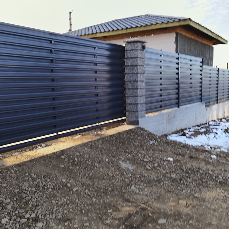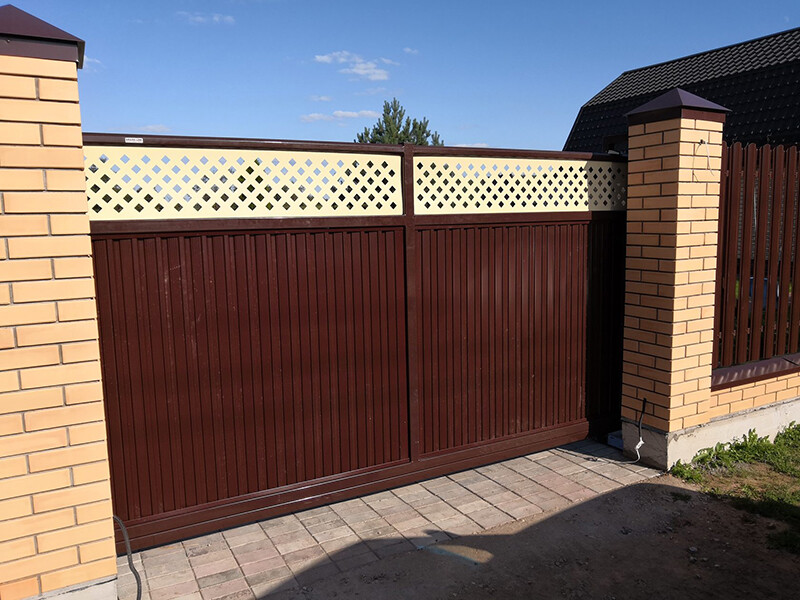 Вместе с забором нам сделали сдвижные электрические ворота шириной 6 метров, не все компании брались за это. Двое распашных ворот.